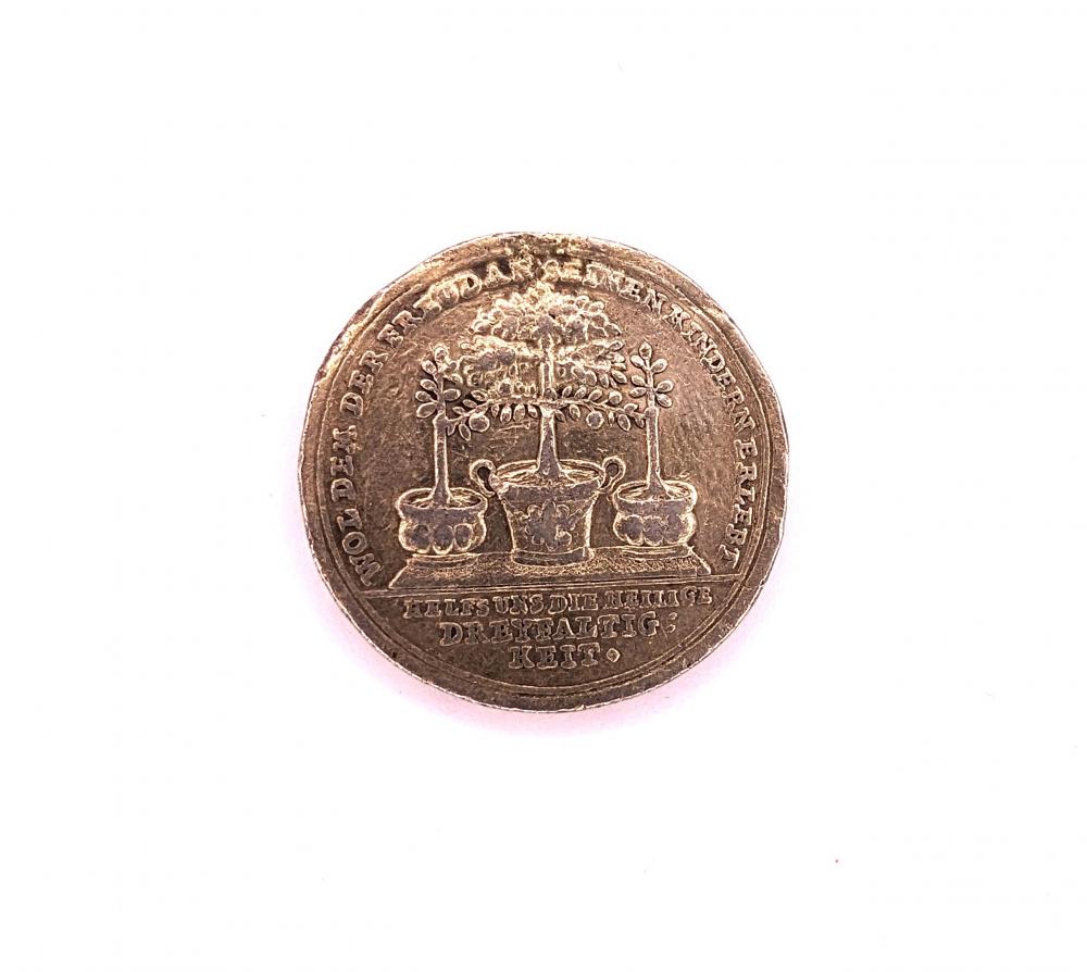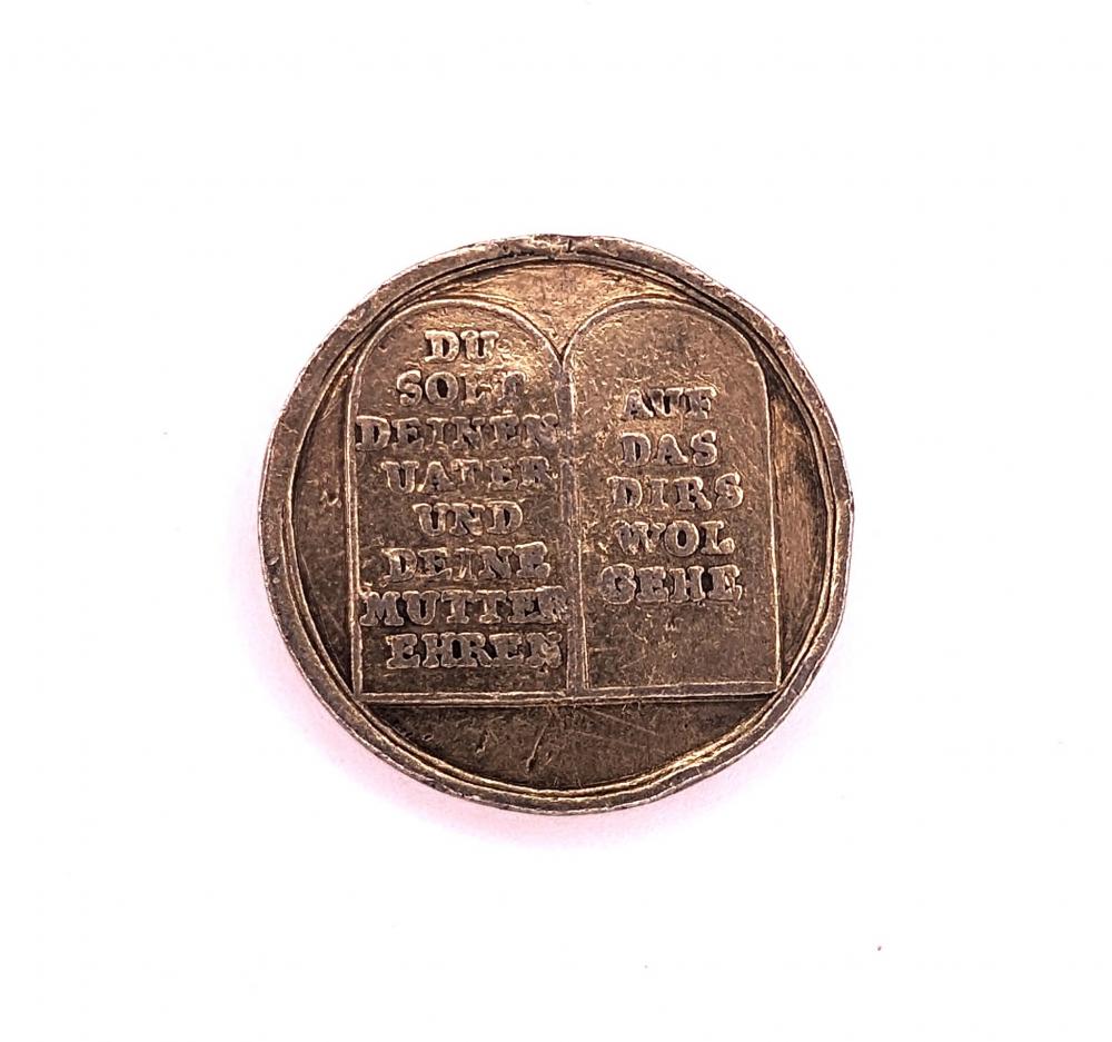 Tag: 1 Ducat, Four Commandments, Coinantiquariat, Trees on Obverse, Fourth Commandment Coin, 2nd Variant, Religious Coin, Commandment Tablets, Ducat Lettering, Numismatic Ducat.