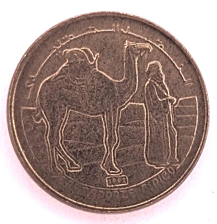 Western Sahara, during the time when this coin was issued in 1992, was in the midst of complex geopolitical tensions and struggles. The Sahrawi Arab Democratic Republic (SADR) was proclaimed by the Polisario Front in 1976, aiming to end Spanish colonization and resist subsequent Moroccan and Mauritanian claims to the territory. The coin's release in the early 90s was significant as it was a period when the UN was intensively working towards a ceasefire and a referendum on the future of Western Sahara. The presence of the camel on the coin, a resilient and iconic desert animal, can be seen as a reflection of the Sahrawi people's endurance and determination during these tumultuous times. Moreover, the traditional depiction of an Arab leading a camel emphasizes the deep-rooted cultural and historical ties of the Sahrawi people to the region, transcending the political disputes.