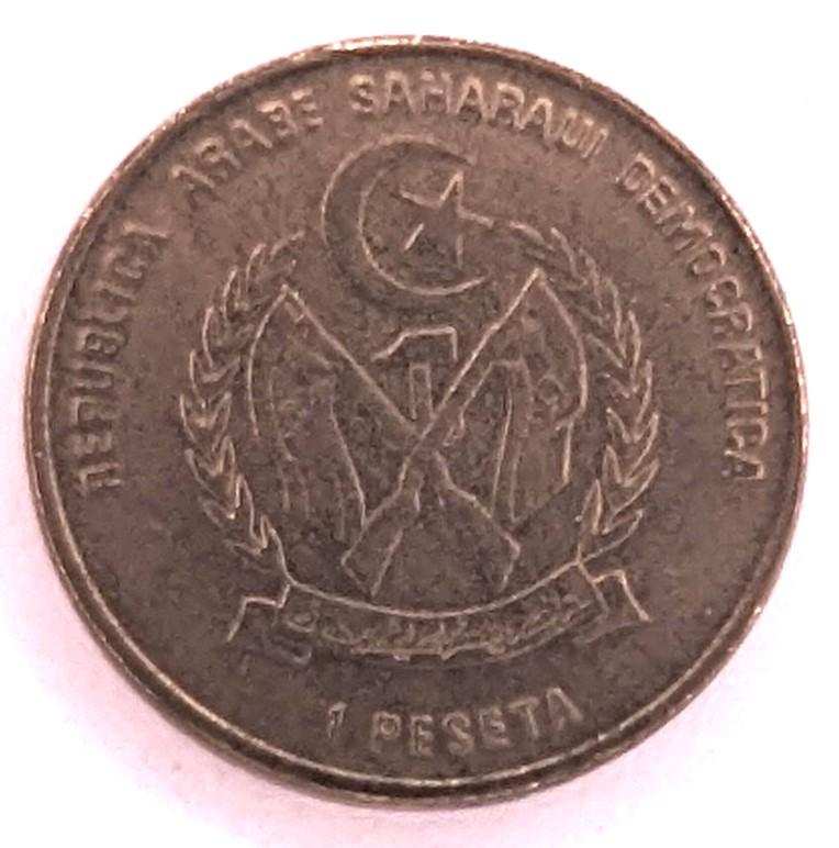 Tag: 1 Peseta, Western Sahara, 1992 Coin, Coinantiquariat, SADR Coat of Arms, Freedom Democracy Unity, Camel and Arab Design, REPUBLICA ARABE SAHARAUI DEMOCRATICA, TRANSPORTE TIPICO, Sahrawi Numismatics.