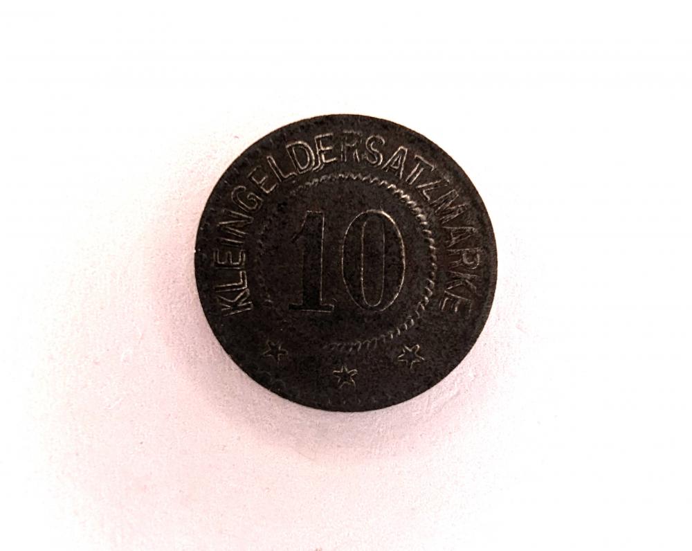 Tag: 10 Pfennig, Fulda, 1920 coin, Knight and Coats of Arms, KLEINGELDERSATZMARKE, German currency, historical numismatics, city coinage, post-war era, substitute currency.