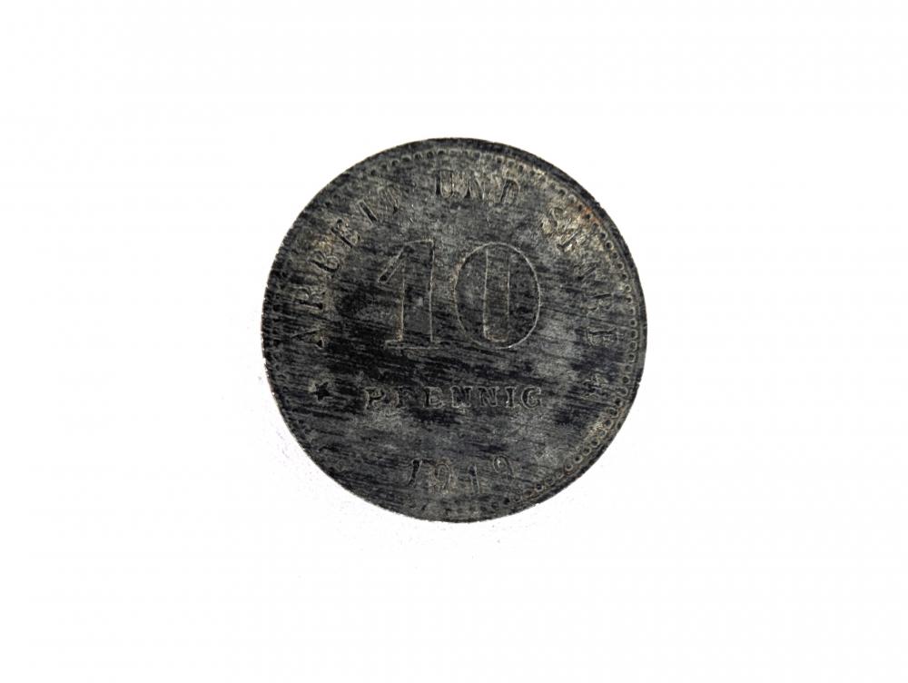 Tag: Weissenfels coin, 10 Pfennig Magistrat, Stadt Weissenfels numismatics, 1919 German coinage, Arbeit und Spare, Saale river coins, Historic Weissenfels currency, Magistrat der Stadt coin.