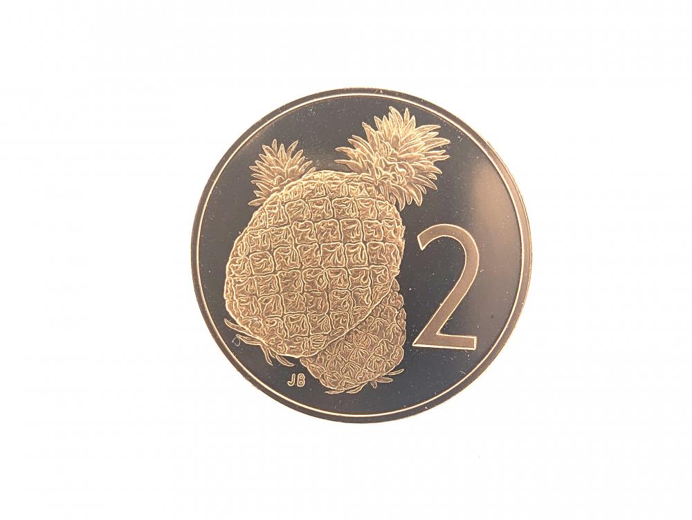 This 1973 2 Cents coin, originating from the Cook Islands, bears the youthful second portrait of Elizabeth II, marking a distinctive period in numismatic history. The obverse intricately presents a young Elizabeth II with the detailed inscription 'ELIZABETH II COOK ISLANDS 1976,' framing the monarch's image above the coin’s minting year. Contrasting the obverse, the reverse delights with a tropical representation, featuring stylized pineapples and the clear denomination, reflecting the unique cultural symbols of the Cook Islands. Struck in both Proof and UNC quality, this release's exclusivity is assured with a limited mintage of only 13,000 units, executed with precision in Australia. This piece is not just currency but a slice of royal history and Pacific heritage combined.