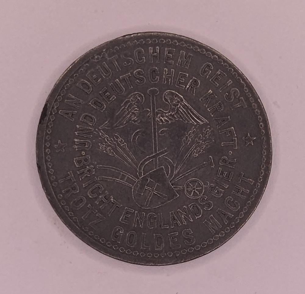Tag: 50 Pfennig, Hattingen Coin, Kriegsgeld 1917, German WWI Currency, Hattingen Coat of Arms, Historical Numismatic Collectible, 1917 German Coin, AMT HATTINGEN, DEUTSCH.KRAFT, TROTZ GOLDES MACHT