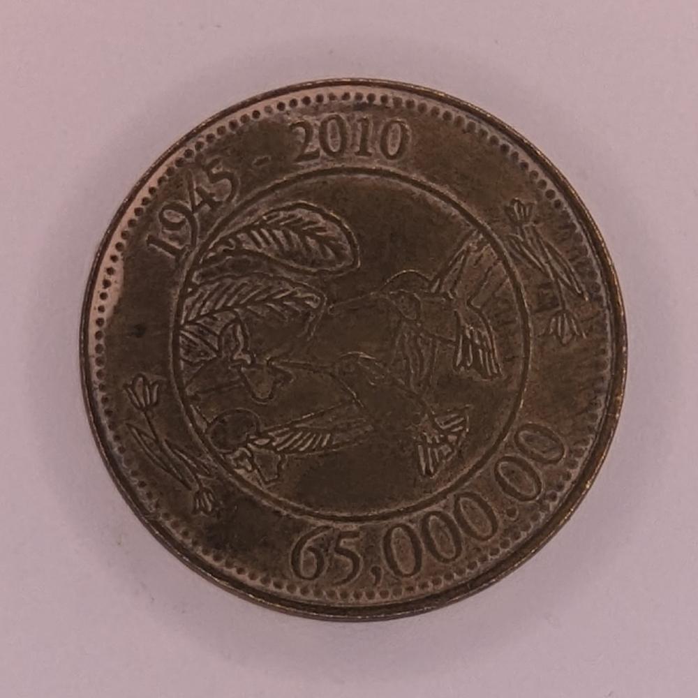 Celebrate the rich history of Bakker, a distinguished company with a legacy of 65 years, with this intricately designed commemorative token. The obverse masterfully integrates a graceful sailboat, surrounded by iconic Dutch tulips, paying homage to the company's establishment in 1945. At the heart lies a grand accolade, marking the 65th anniversary of the company and offers the opportunity to win a prize of €65,000 when someone buys flowers. On the flip side, nature's delicate wonders, two hummingbirds, are encapsulated within an inner circle, echoing the company's milestones. This token is not merely a collector's item but a tribute to Bakker's commitment to excellence, renowned for its plant sales via mail.