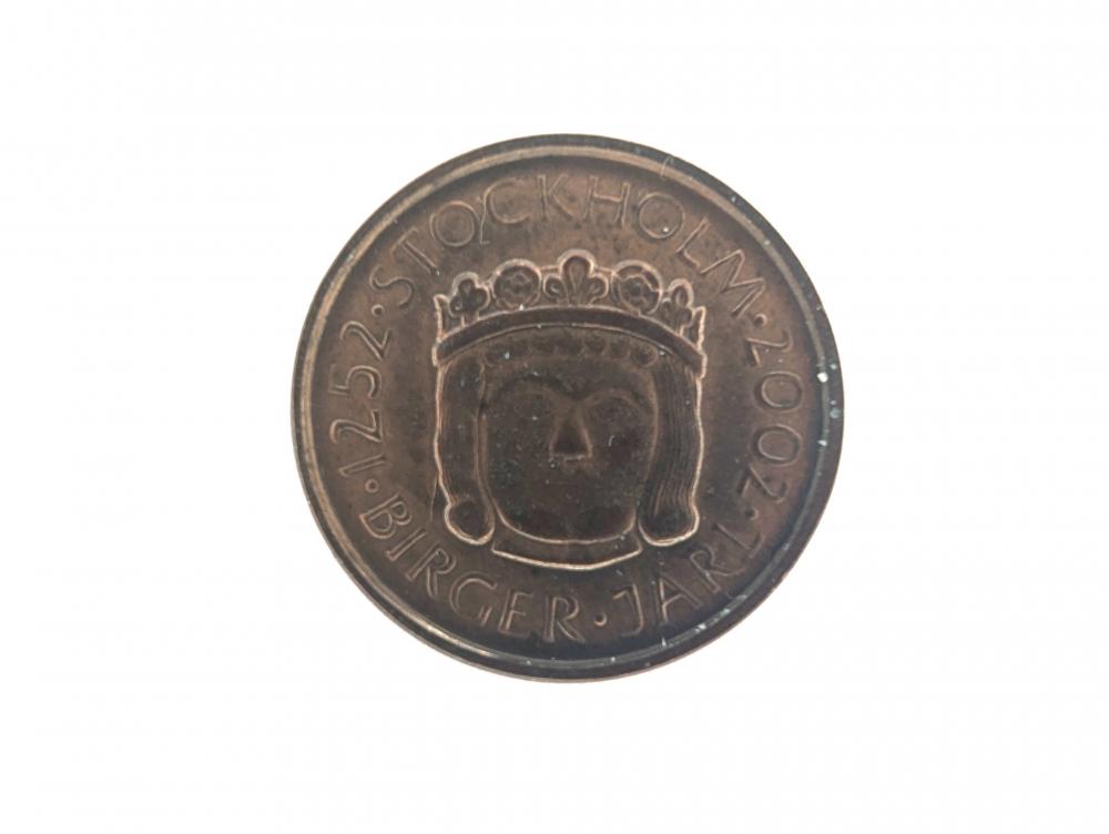 commemorative medal, struck in celebration of the city's 750th anniversary. Its obverse commands attention with the stately bust of a king, possibly alluding to Birger Jarl, the city's reputed founder, surrounded by the inscriptions 'STOCKHOLM 1252 - 2002' and 'BIRGER*JARL,' signifying the historic milestones