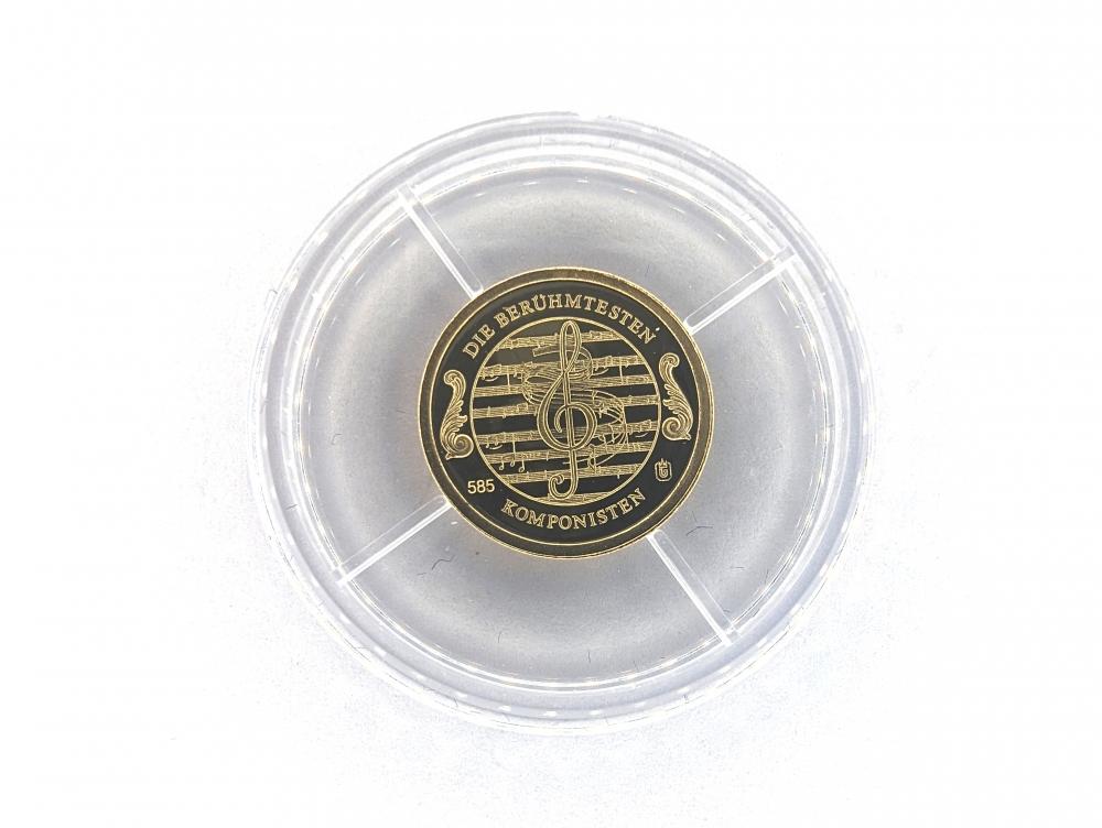 Johann Strauss Medal, a commemorative piece paying homage to the 'Waltz King'. The obverse presents a detailed depiction of Strauss, slightly oriented to the left, set among delicate ornaments and a watchful angel, with the inscription 'JOHANN STRAUSS 1825-1899' marking his lifespan. In a symphony of artistry, the reverse features a collection of musical notes, symbolizing his vast contributions, underscored by the phrase 'DIE BERUHMTESTEN 585 KOMPONISTEN,' alluding to the gold's .585 purity. Minted with precision by Bayerisches Münzkontor, Waldaschaff