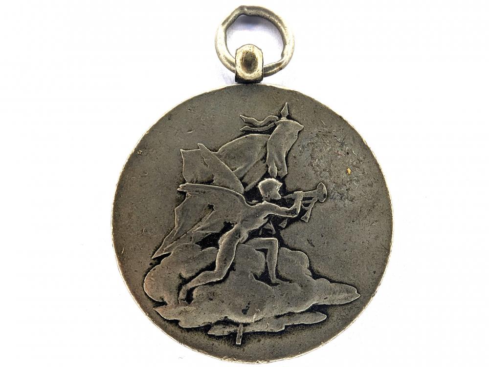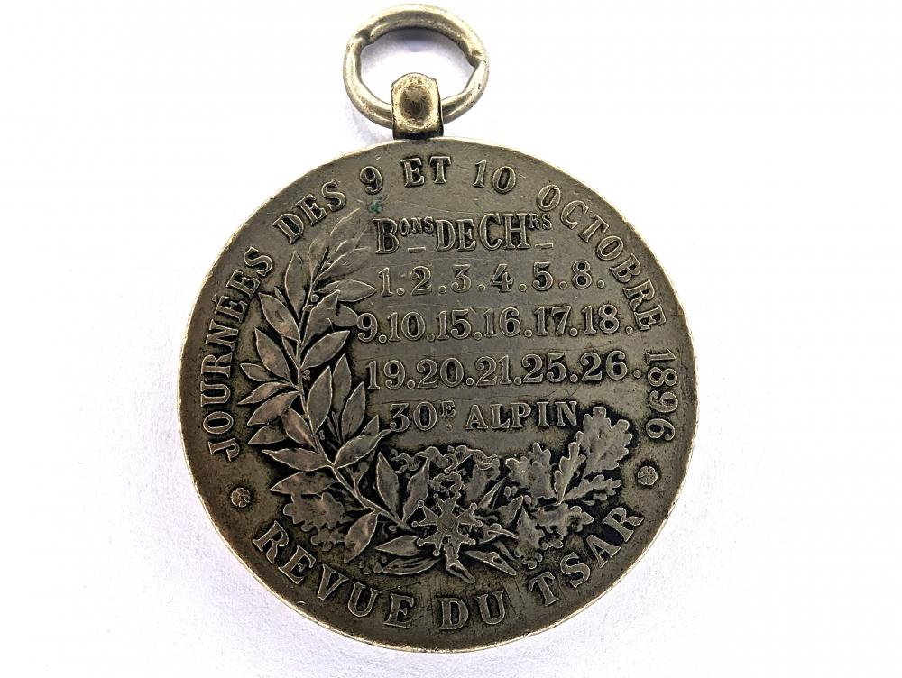 Tag: Tsar Nikolai II, Paris Visit Token, 1896 Token, Numismatic collectible, Laurel wreath design, Winged angel, Historical Paris events, Russian Tsar in Paris, Alpin, Commemorative coin.