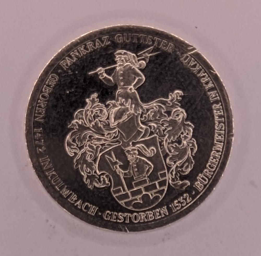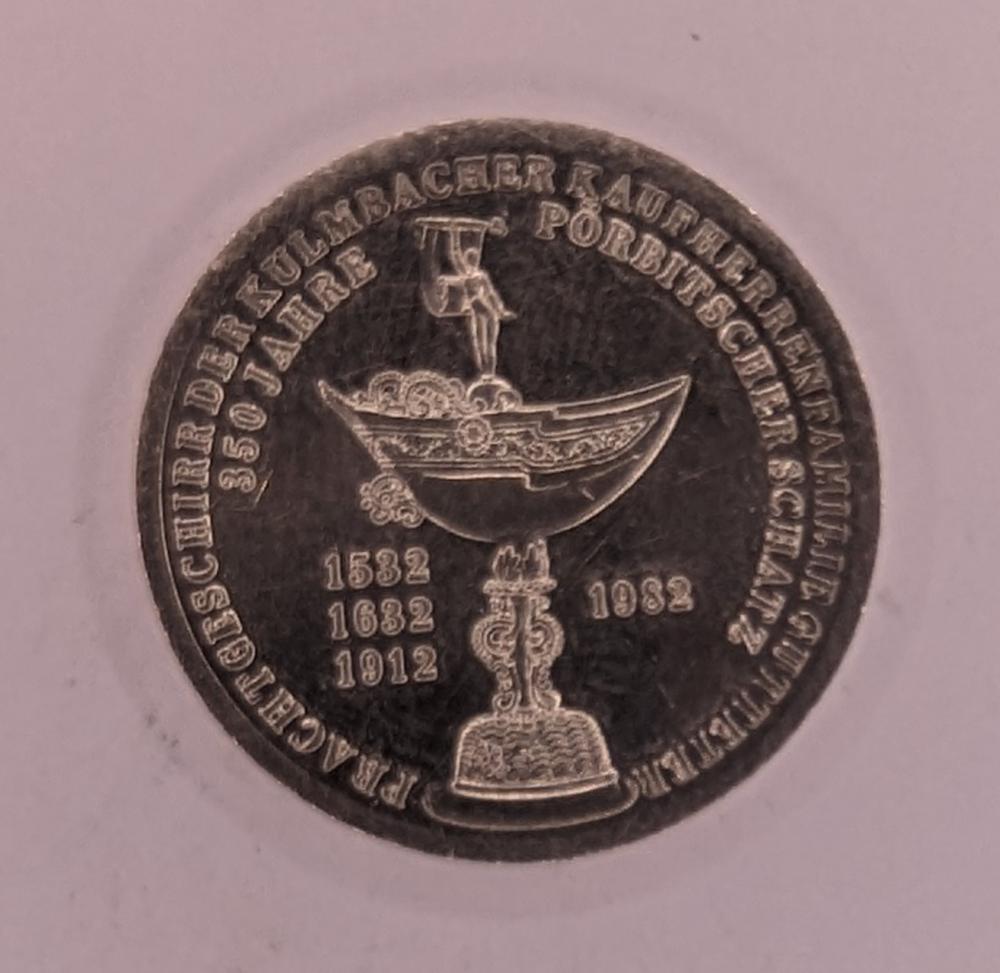 This numismatic marvel commemorates the 350-year celebration of the Porbitscher treasure discovery, intricately showcasing a treasure piece resembling a ship-formed cup. The reverse captures the essence of Bavarian pride with its coat of arms, crowned by the stoic figure of Pankraz Gutteter, a native of Kulmbach born in 1472 and a respected mayor in Krakow until his passing in 1552. This medal not only encapsulates significant historical events but also immortalizes Gutteter's influence, making it a coveted piece for collectors and history enthusiasts alike. Obverse shows Piece of treasure resembling a ship made in a form of a cup in centre and it reads PRACHTGESCHIRR DER KULMBACHER KAUFHERRENFAMILIE GUTTETER 350 JAHRE PÖRBITSCHER SCHATZ 1532 1632 1912 1982. Reverse shows Coat of arms of Bavaria with Pancratz Gutteter standing above and in center and the lettering is PANKRAZ GUTTETER * GEBOREN 1472 IN KULMBACH * GESTORBEN 1552 * BÜRGERMEISTER IN KRAKAU