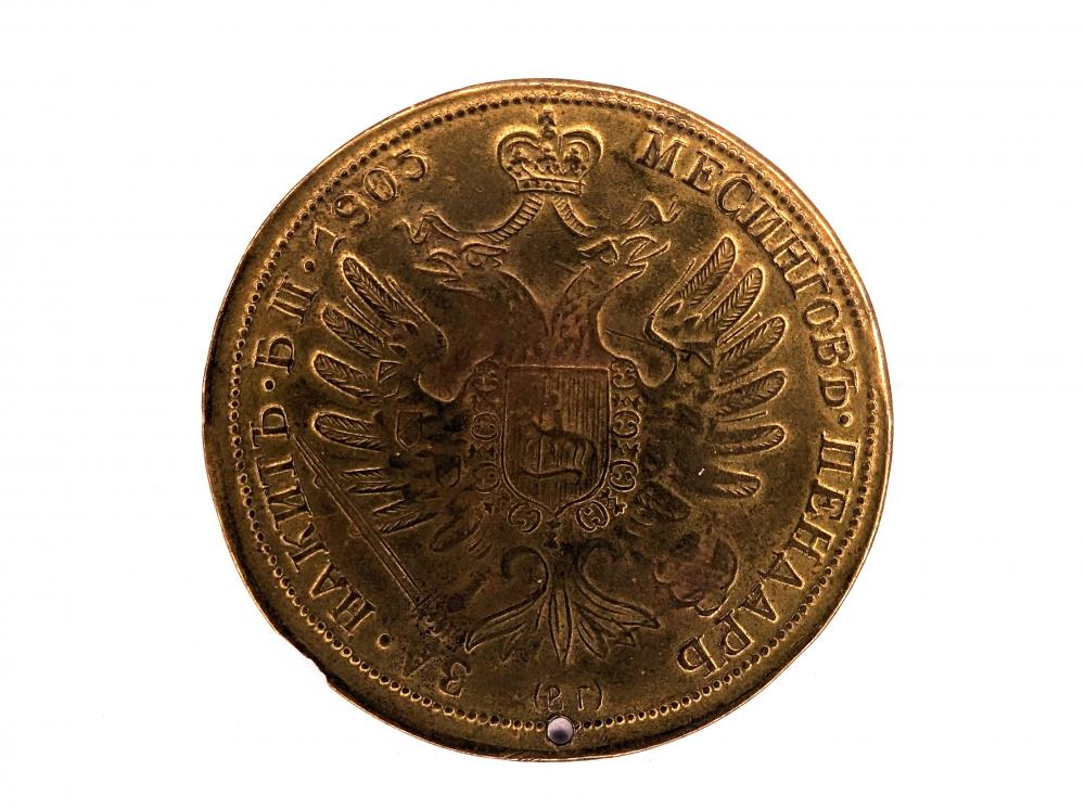 This brass token (pendar), minted in 1905, is a replica pendar commemorating Alexander II of Russia. The obverse boasts a right-facing bust of Alexander II with the Cyrillic inscription "АЛЕКСАНДЪРЬ II РУСКИ ИМПЕРАТОРЪ". On the reverse, a crude representation of the Russian Empire's Coat of arms is visible, accompanied by the Cyrillic lettering "МЕСИНГОВЪ ПЕНДАР ЗА НАКИТЪ 1905 4". Historically, this piece has been used for national folklore events in Bulgaria, often incorporated into traditional folklore clothing, adding a touch of antiquity and cultural significance. This piece is holed, all of the pendars are, given that they are sewed into clothing. Thickness is 0.9mm