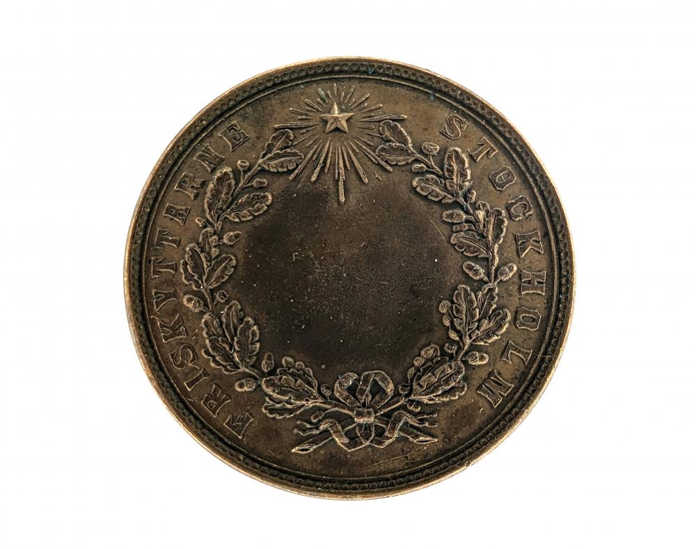 Token, designed for a sniper shooting competition in Stockholm, carries the essence of precision and skill. The obverse intricately depicts a scene at a shooting range, with a focused individual aiming to shoot amidst a forest backdrop. Flipping to the reverse, a radiant star shines above, encircling a laurel wreath, emblematic of victory and honor with the inscription "Friskyttarna Stockholm"