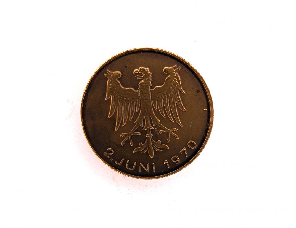 Celebrating 750 years of the town of Pfullendorf, this commemorative medal encapsulates its history and pride. The obverse displays a majestic castle, with the inscription "STADT PFULLENDORF 750 JAHRE" as a testament to the town's long-standing heritage. On the reverse, Pfullendorf's coat of arms is showcased, marked with the date "2.JUNI 1970", signifying the anniversary.